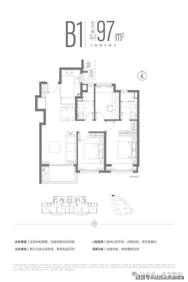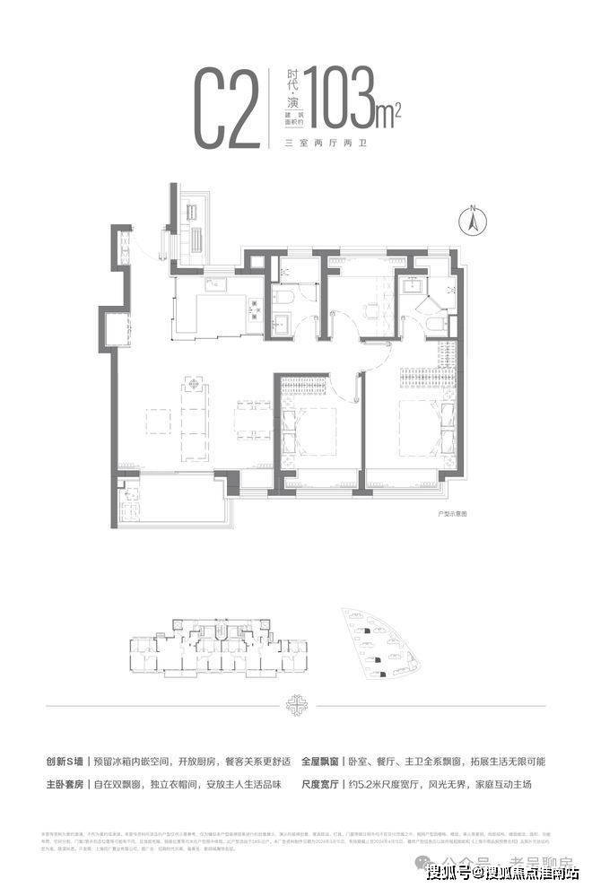 建面约103m²三房两厅两卫户型,南北双卧L型270°揽境飘窗设计,更大限度地让自然融入与自在之中,更宽阔的空间尺度,让自在生长与自然之中。