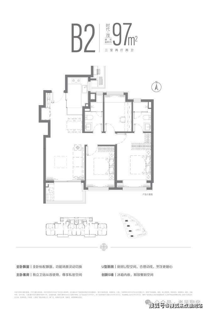建面约97m²三房两厅两卫户型,全卧+主卫飘窗配置,并通过飞机户型空间布局,提升了空间的使用效率,让温情在自然中自然发生。