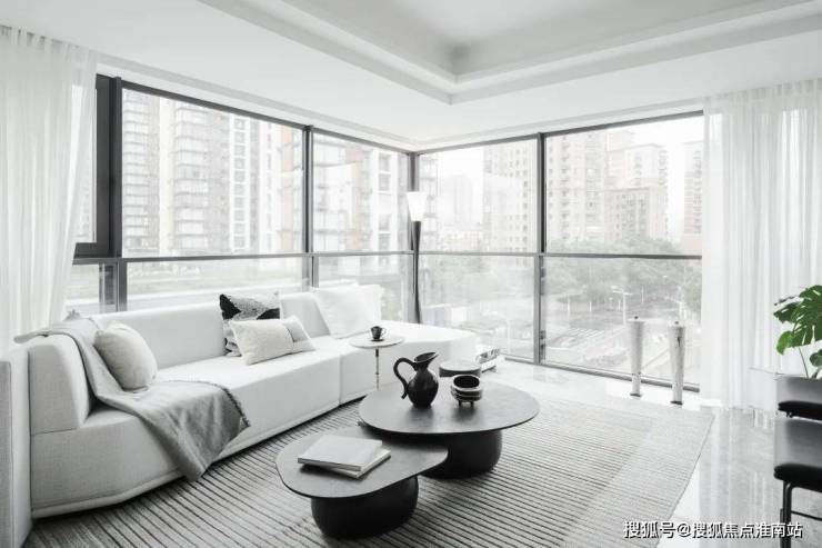 实拍图落地窗:270度转角落地窗扩展了客厅的视觉尺度,同时也打造了城市风景画幕的视觉效果,