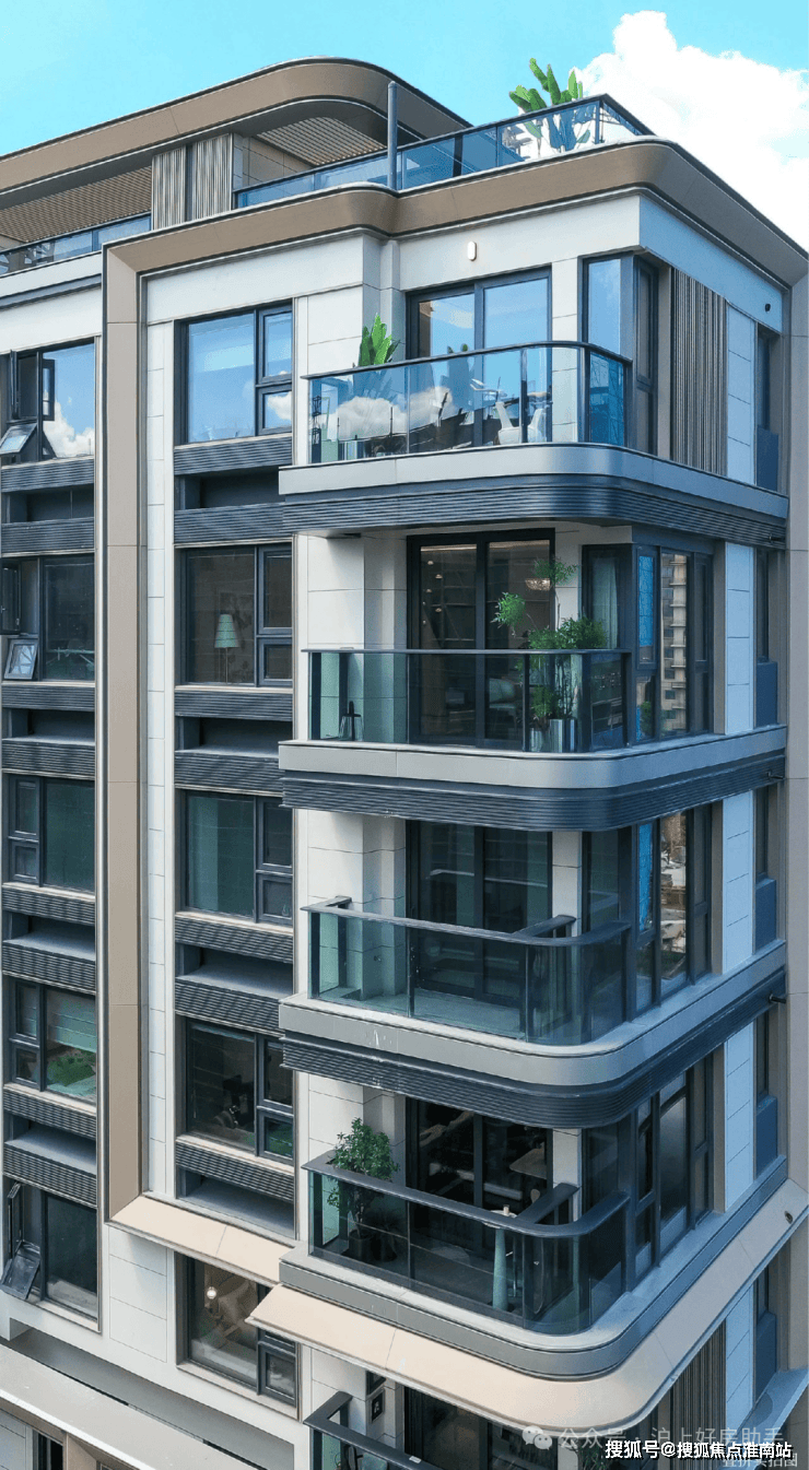 整个小区都采用统一的设计语言,高层和叠拼产品全部采用弧形阳台形制,柔性的圆弧搭配简洁有力的直向线条,厚重中带着轻灵,低调中彰显优雅。