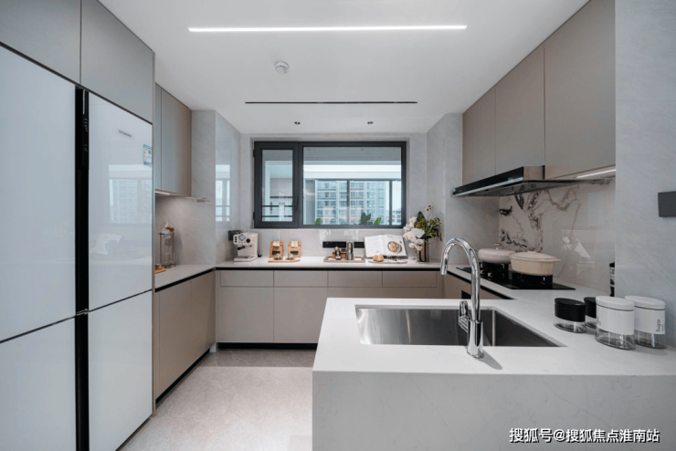 为让空间更凸显尊贵的艺术格调,室内应用大量大牌奢石元素,比如客厅背景墙、厨房挡油板选用了芬迪白岩板,浴室柜台选用了原产地为意大利的烟雨江南石材等,居家更显奢华高级感。