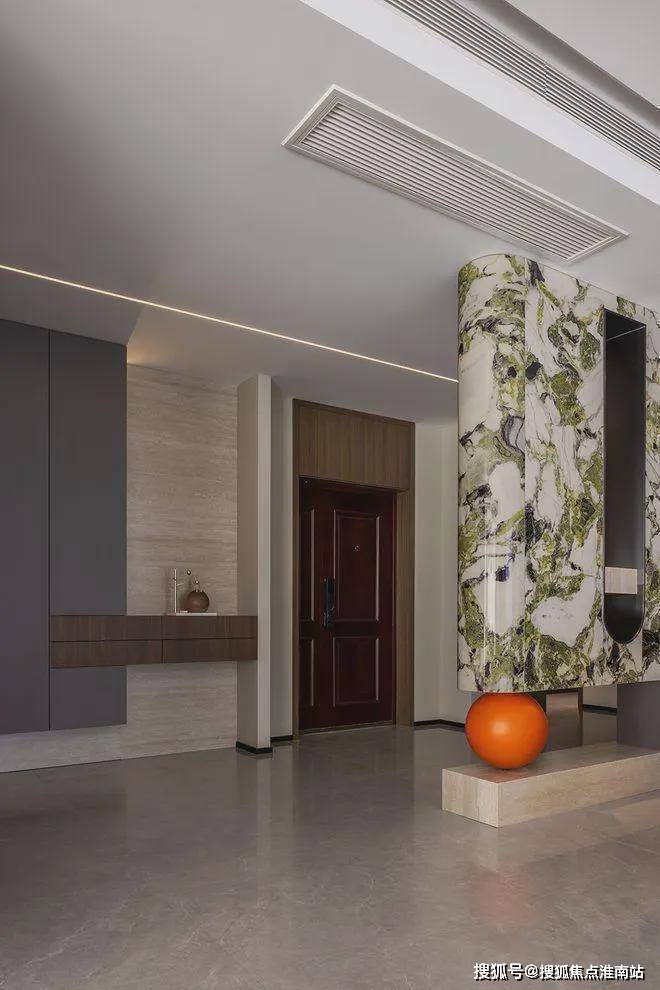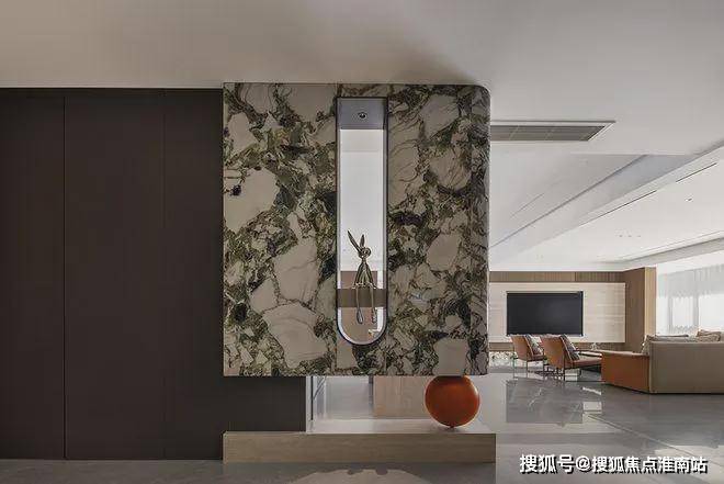 入户玄关,应用了翡翠绿岩板热弯工艺,低奢材质的选择,打造时尚优雅的宜居之境,使空间散发浪漫气息,成为空间的点睛之笔。