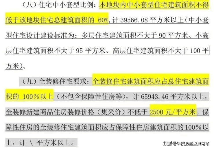 根据土地转让合同要求显示,项目规划住宅套数下限656套,全部装修交付,装标2500元/m²(集采价)