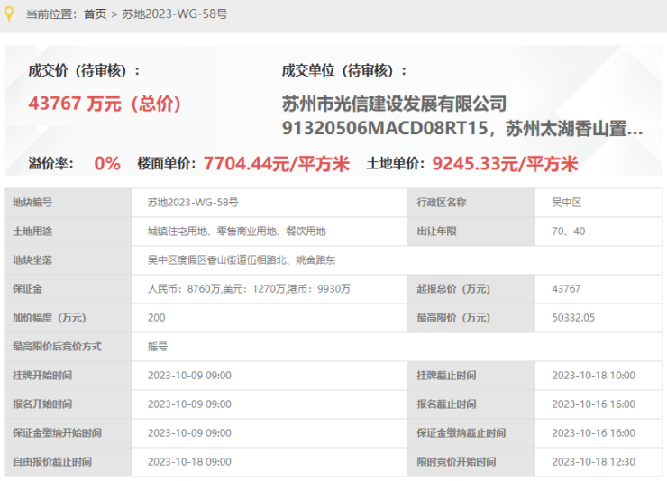 太湖朗墅,即,苏地2023-WG-58号地块,位于吴中区度假区香山街道伍相路北、姚舍路东,是2023年10月18日,光信建设& 太湖香山置地 以底价43767万元竞得,成交楼面价7704元/平,溢价率0%。