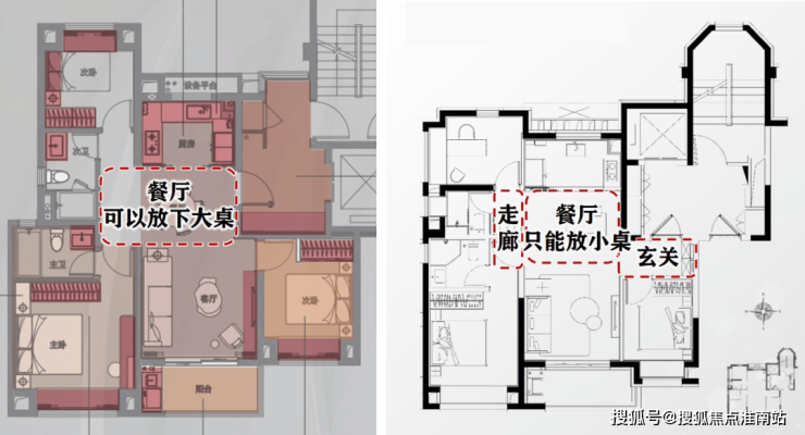 客厅、主卧的面宽都比市面上的常见产品多出了将近0.5米,餐厅面积更是比常规三房大了一倍,大大改善了小面积做多功能时带来的空间局促感,做出了使用率约85%的王炸户型