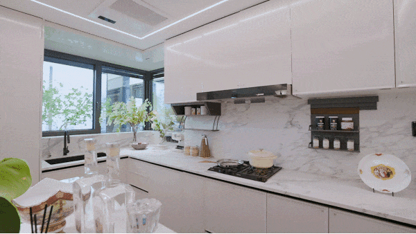主人在U型高效厨房忙碌,转身就能加入客厅的谈天说地,灶台的烟火气,瞬间化作亲情的暖流。环幕视野的阳台,是清晨咖啡的观景台,也是孩子眺望星空的瞭望塔。烹饪、会客、观景、亲子…生活场景在此自由切换,无缝交融。