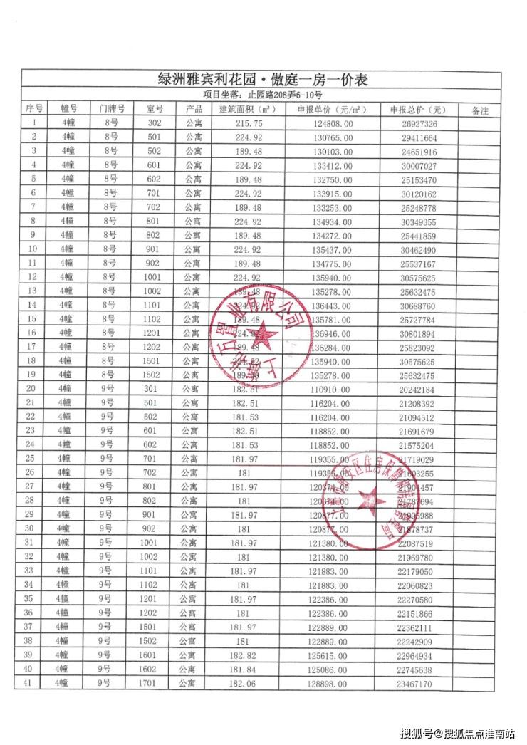 上期一房一价表如下: