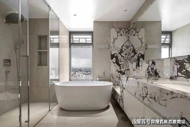 主卧设有衣帽间及尺度功能配置齐全的卫生间,内部双台盆、淋浴房、浴缸齐备。