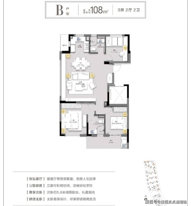 建面约108㎡户型就略带一些改善的意味了。高端项目常见的大边厅,营造了客厅、餐厅、厨房开放打通的“LDK一体化”模式,使空间感更加通透。U形厨房让动线更加流畅顺滑,尺度感甚至可以和市场上一些改善产品不相上下。