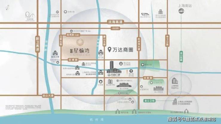 一是密集的「核心商圈资源」,复地星愉湾地处新城繁华地段,直线距离约700米就是约20万方的金山万达广场。