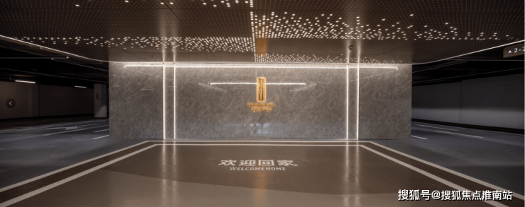 星空连廊的顶面采用香槟金铝板、墙面为爱马仕灰仿石砖,并镶嵌金属线条、就连地面都采用了夜里雪仿石砖。