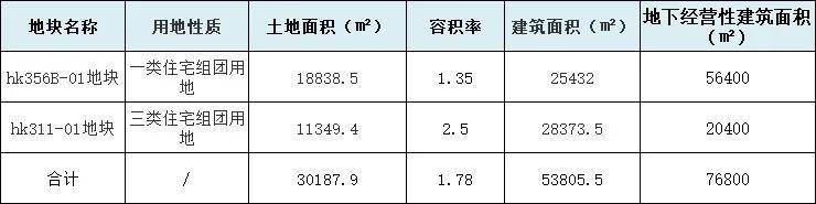hk356B-01地块为一类住宅组团用地,土地面积18838.5㎡,容积率1.35; hk311-01地块为三类住宅组团用地,100%全装修,土地面积11349.4㎡,容积率2.5。