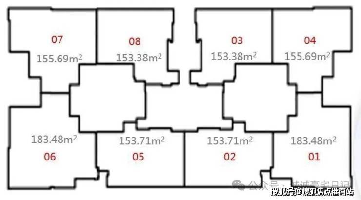 该栋分为A/B单元,每个单元有四个单位:包含3套153㎡及1套183㎡,平面布局与住宅相似。