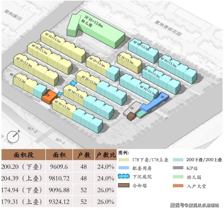 该地块拟建设13栋4F叠加别墅,有4个主力户型,包括建面约178㎡上、下叠,建面约200㎡上、下叠。其中,建面约178㎡上下叠主要分布在地块西侧,建面约200㎡上下叠主要分布在地块东侧。