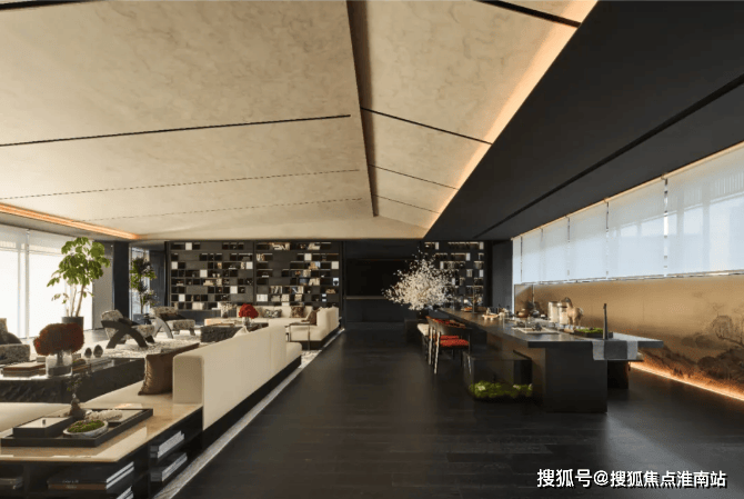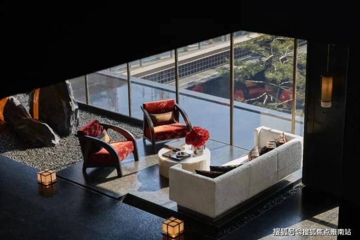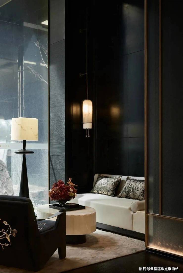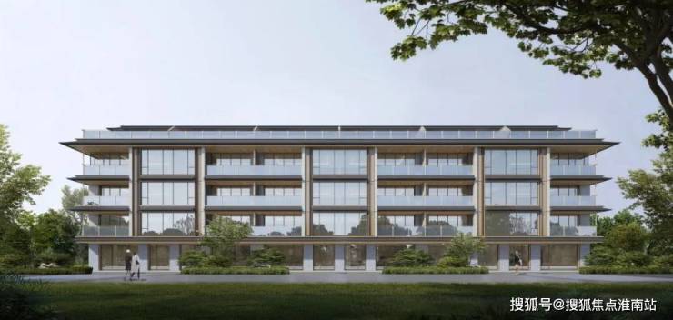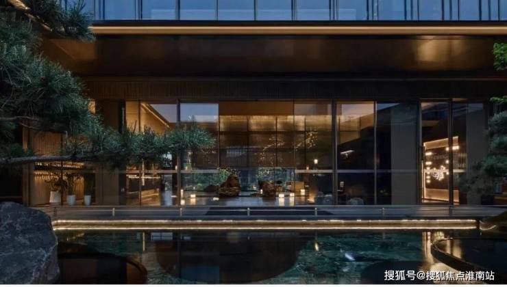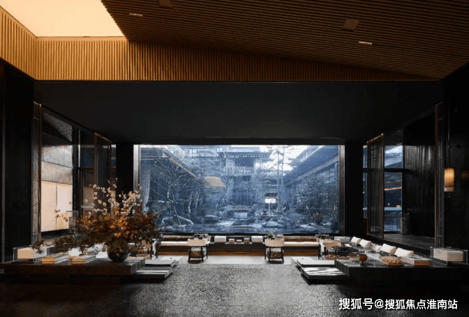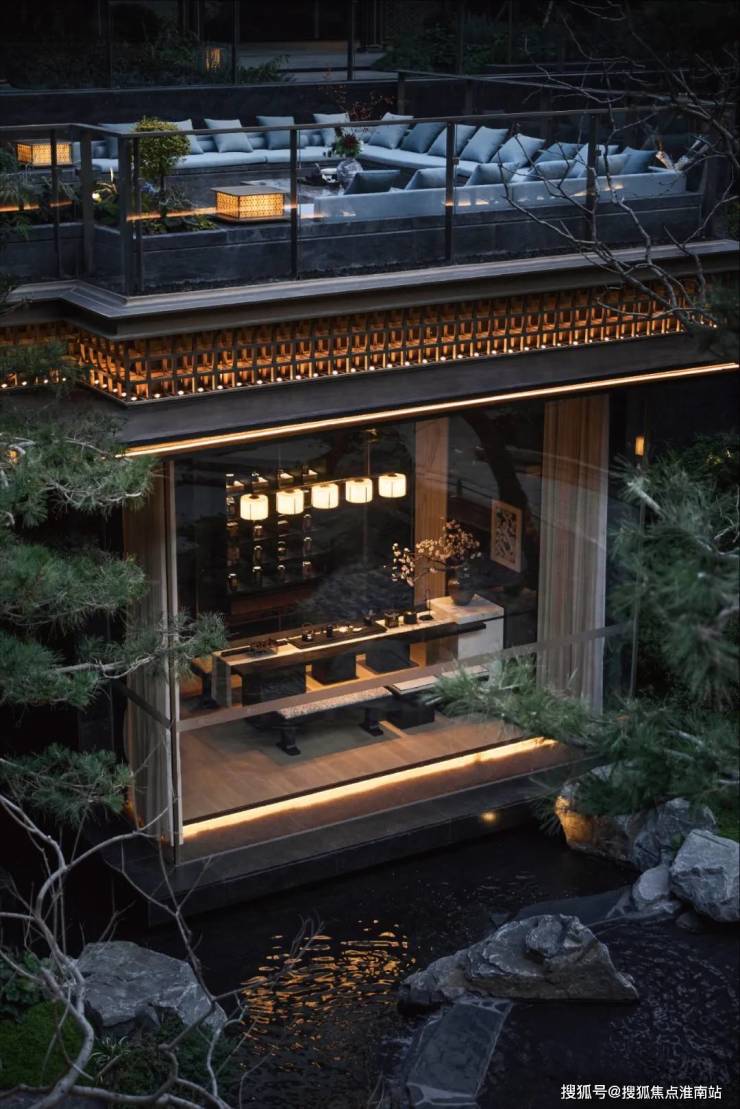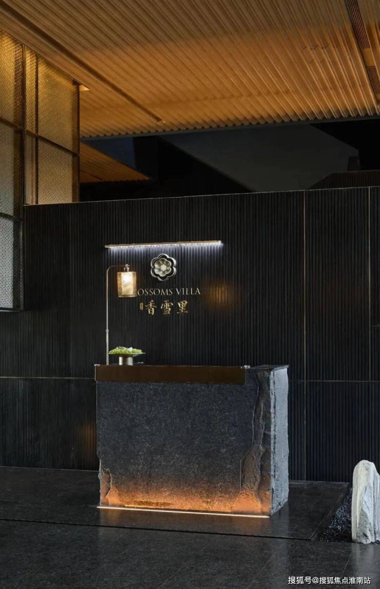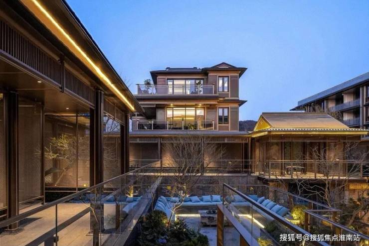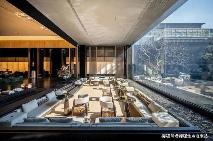 建筑外立面以香槟金铝板为基调,搭配蓝眼睛石材与玻璃幕墙,融合传统歇山重檐、纳福悬鱼等元素,既保留宋式建筑的对称美学,又赋予现代建筑的轻盈通透。合院组团采用三面庭院设计,L型景观面与环绕式檐廊,将超山梅影、丁山湖光引入每一扇窗景。