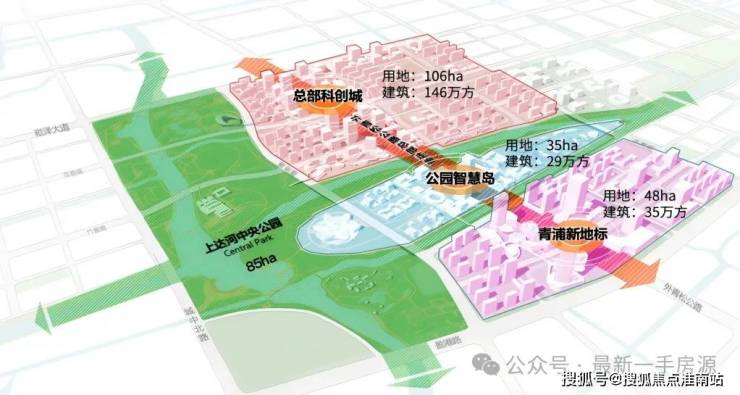青浦新城划定了“1+3”重点发展区域,其中约6.5平方公里的中央商务区是核心所在,盘古云曦位于中央商务区中的北区总部科创城。