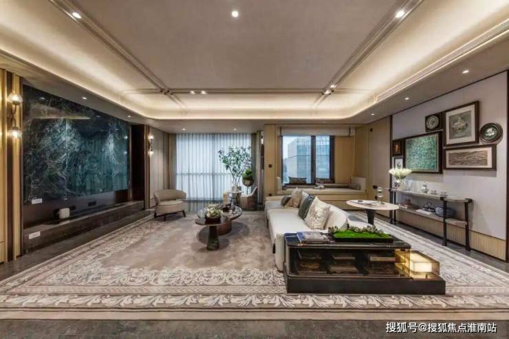 在装饰细节上,从天花板的曲面吊顶、墙体的圆角过渡,到定制家具的流畅线条,都在诉说喜曲不喜平的优雅,天花吊顶,更有刻槽工艺,融入项目logo,赋予业主独一份的尊崇。