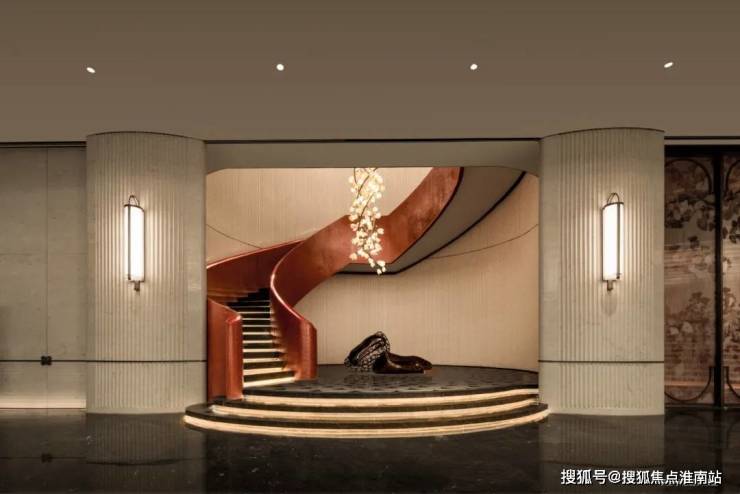 ①繁花之梯,同频百年华尔道夫,以精工细节打造海派艺术空间,一抹红色艺术楼梯是会所中的点金之笔,其形态宛若一缕红飘带,点缀于会所当中。