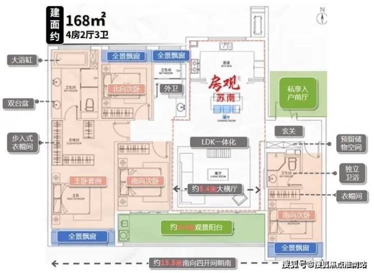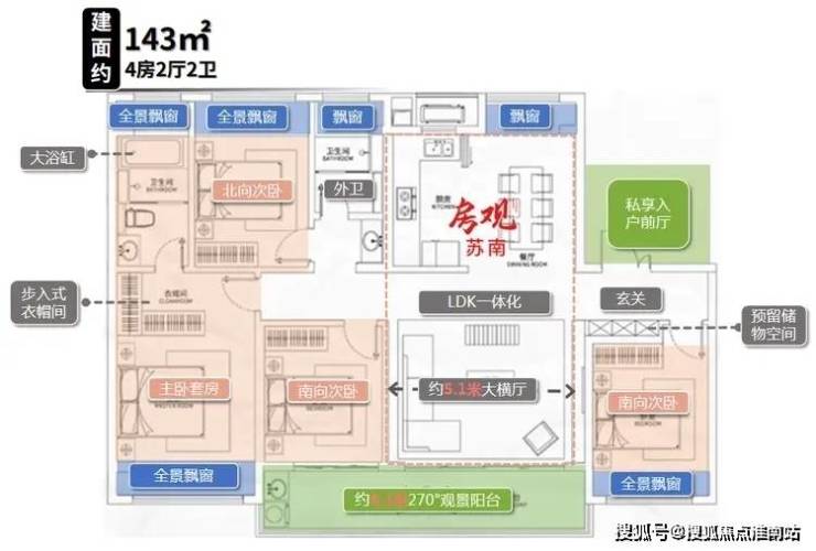 整个户型采用了高端住宅流行的LDK设计理念+阳台大转角270°采光+6个飘窗设计。
