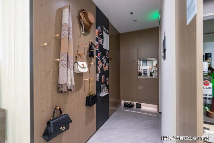 并且,玄关柜和鞋柜的部分做了非常多的功能分区设计,小到隐藏的穿鞋凳、伞架和扫地机器人,大到除臭精灵、长靴、行李箱,都能放进这个空间内。
