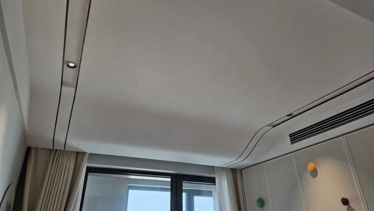 第三,弧形吊顶的应用。在建面104㎡三房的样板间里,北卧室甚至采用了海浪形的吊顶,这对于压弯工艺的难度要求,是呈指数级上升的。