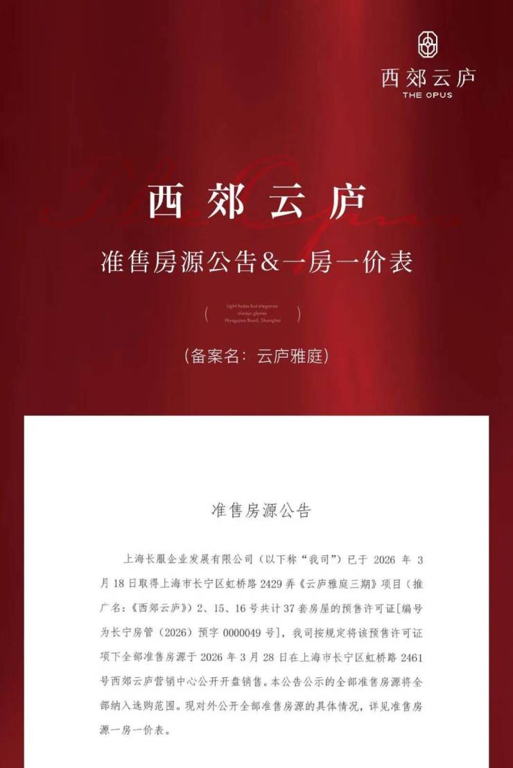 最新消息:长宁西郊“天选”改善神盘【西郊云庐】三批次已取证,主推建面约104-307㎡房源,仅37套,均价约123225元/㎡,今日(3.21)开启认购!