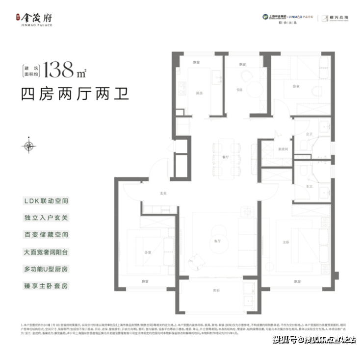 项目洋房全系无连廊设计,得房率高。如建面约138㎡户型,四叶草布局,南北通透,实得面积相当于一般高层住宅145㎡户型。除此之外,这个户型还有“真改善”不可或缺的三重优势: