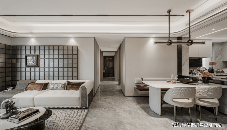 ·电视背景墙采用仿石岩板和纯铜材质组合,细节之处彰显奢华品质;