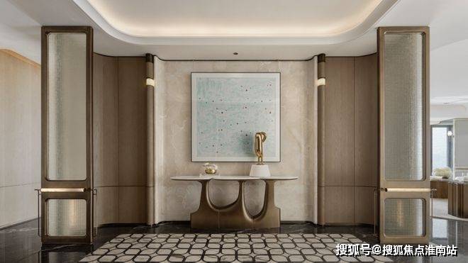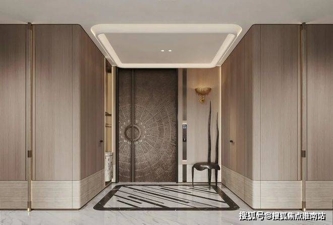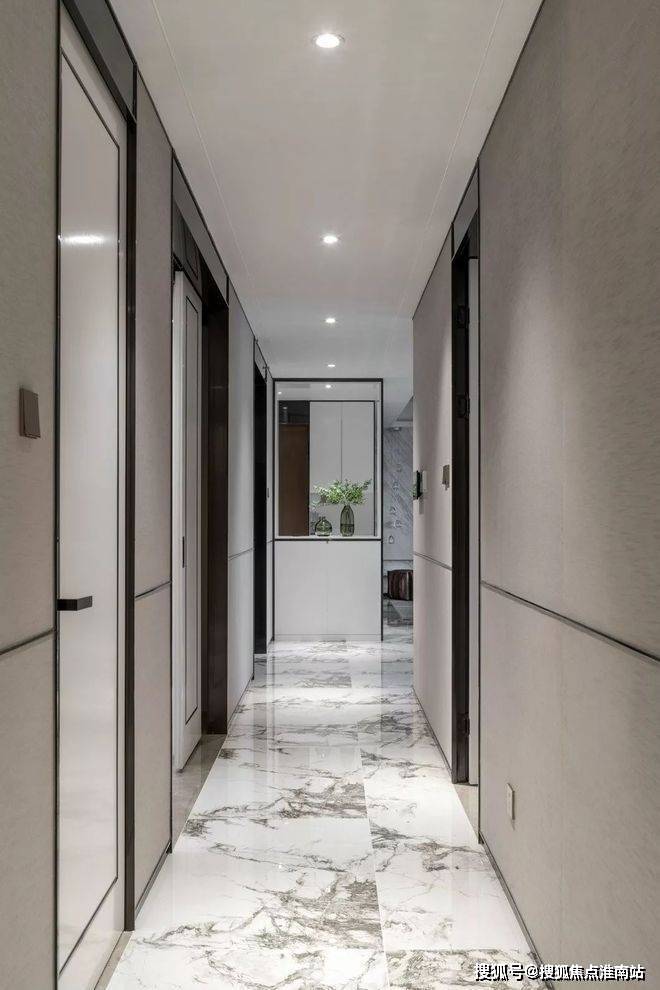 透过鞋柜看向过道,门全部做了到顶的处理,中间的腰线在公共开放区域是整体贯穿的元素,并结合柜门的开启高度,硬包的中线高度等等做了一个整体的联系。