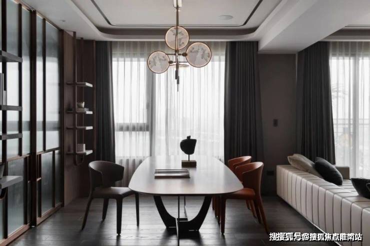 ▲餐厅旁边是书房空间,以长虹玻璃推拉门作为隔断,在金属边框的设计下,与餐厅的吊灯形成呼应,门两侧是木饰面+吊架书架的设计,也是显得简约华丽而高级.