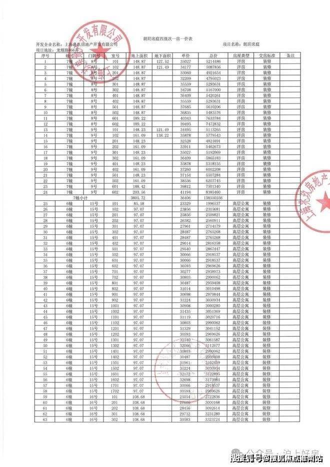项目一房一价表