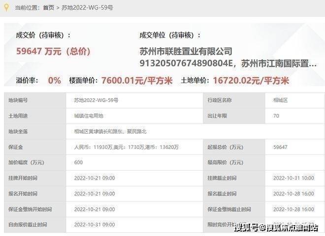 青云台,即联胜&江南国际59号地块,位于相城区黄埭镇长和路东侧、聚民路北侧,2022年10月由苏州市联胜置业有限公司&江南国际联合底价竞得!成交总价59647万元,成交楼面价7600元/㎡,溢价率0%。