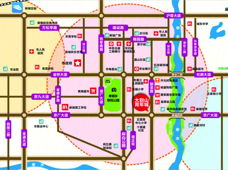 商业:项目自带18000㎡精品商业配套,2公里范围内抵达桃盛购物广场、朝圣路商业街、麻城步行街、摩尔城
