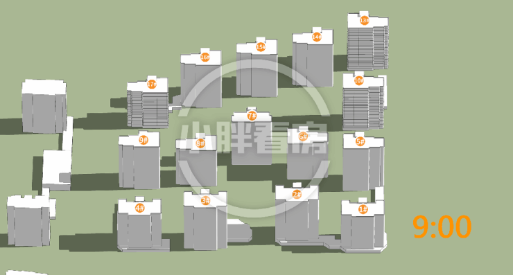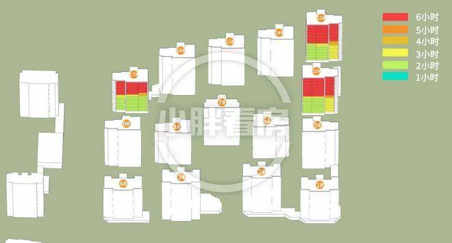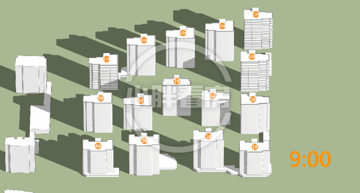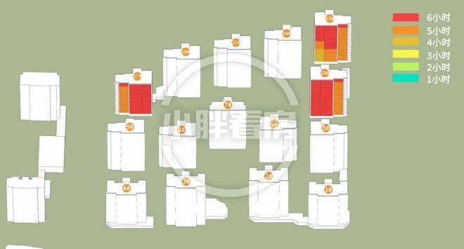 17号楼采光优异几乎不存在遮挡,10号楼低层受遮挡,13号楼中低层受遮挡。就具体遮挡时间而言,10号楼主要在傍晚受7号楼遮挡,13号楼主要在下午受14号楼遮挡。
