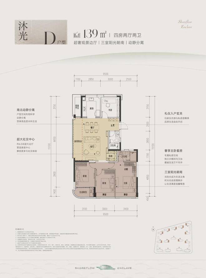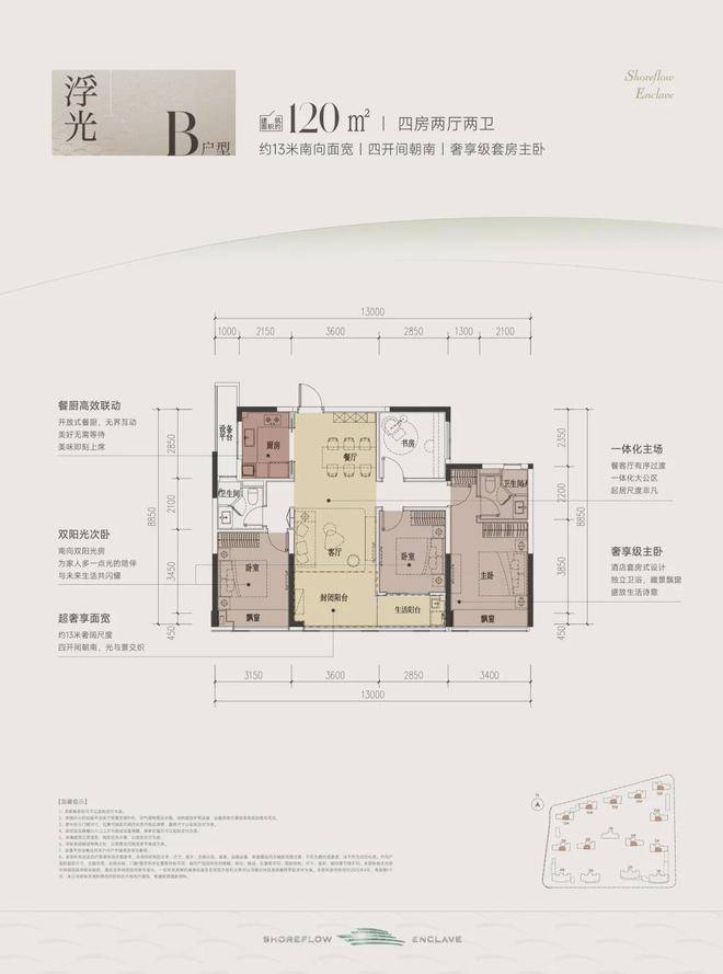 这款户型堪称四开间朝南的“流量王者”,南向面宽约13米,双联阳台+双飘窗设计,视野和采光优秀;套房主卧、双阳光次卧,颇有大平层的气势。