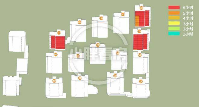 滨江时舟里的分析结果是这样:计算已考虑周边所有建筑的影响,结果表明周边建筑不会对本次开盘楼栋产生遮挡,楼栋仅受地块内部遮挡。
