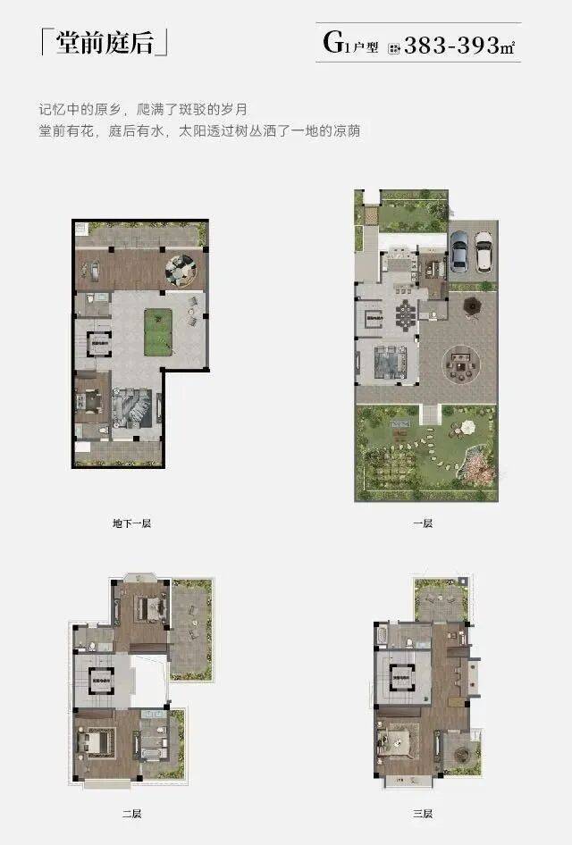 双开间设计,G1/G2户型均为四房两厅四卫,地下一层为娱乐区,地上三层含主卧套房及观景露台