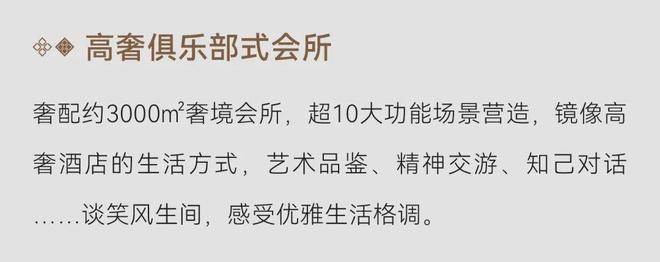 与此同时,项目还打造对标高奢酒店级会所,约2600m²规制,涵盖私宴厅、恒温泳池、健身中心、行政酒廊、红酒雪茄吧等。