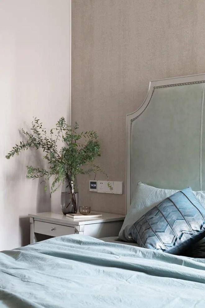 实木床的稳定与厚重,搭配蓝色床单的安静与惬意,使得空间环境更加适合睡眠。