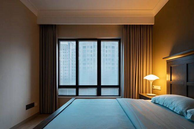 灰咖色的墙面空间与窗帘,在床头柜摆一张暖色调的台灯,让父母房满屋都是朴素的温馨感。