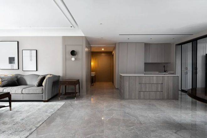 客厅空间整体灰色调的地面基础,天花简洁的吊顶加入无主灯设计,带来一个现代优雅的大气空间感。