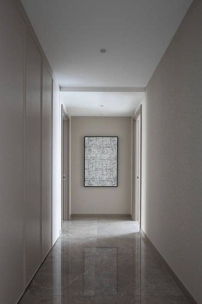 过道在客厅与餐厨区之间,走廊尽头的墙面挂上一幅独特的几何抽象线条装饰画,也提升了空间的层次与现代设计气质。