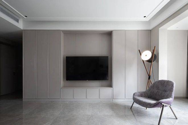 电视墙以灰色定制电视柜的设计,壁挂安装电视机,旁边布置落地灯与一张休闲沙发椅,在简洁现代的空间下,带来一种优雅舒适的居住体验。