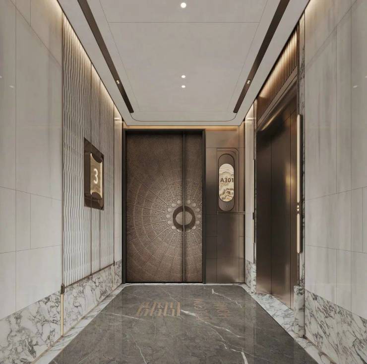 透过鞋柜看向过道,门全部做了到顶的处理,中间的腰线在公共开放区域是整体贯穿的元素,并结合柜门的开启高度,硬包的中线高度等等做了一个整体的联系。