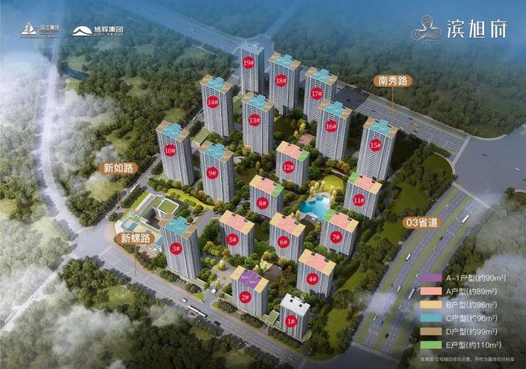 滨旭府总建面约23.5万㎡,由9幢高层(27层)+8幢小高层(18层)+1幢公租房(19号楼)+1幢自持(1号楼)及一所幼儿园组成。小高层主力户型为约89㎡中间套,约98㎡边套,有少量约110㎡边套;高层主力户型为约96㎡中间套,约99㎡边套