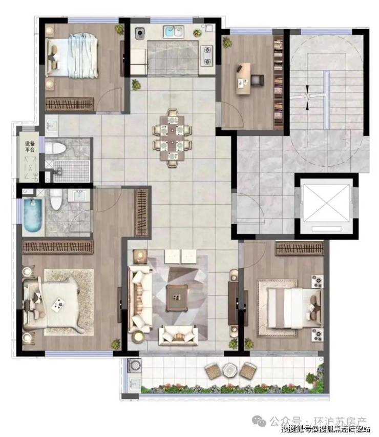 2、客厅与餐厅之间以台阶连接:用最原始的“高差”手段,以零占地的垂直维度实现分区,保留90%以上的视觉通透性。