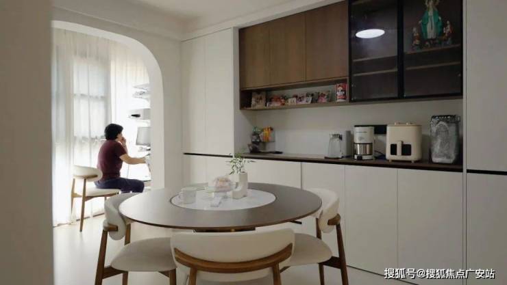 当夏季风扇低转速时,风扇灯将热浪切成薄片,光影在墙面投下动态复古电影胶片效果;靠墙定制整面收纳柜,其中开放格占比30%,用来展示业主淘来的好物件;而相比长方形餐桌的主客之分,圆桌消除等级感,还原家庭聚餐的平等氛围。