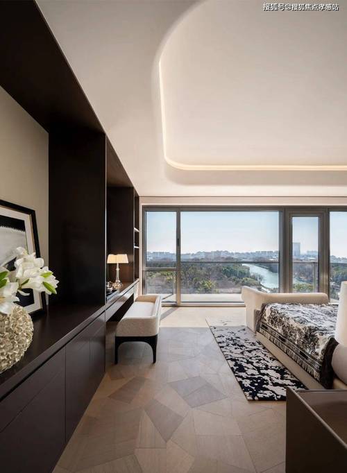 这客厅既是270°全景舱厅,无论全家在餐桌前欢聚一堂,还是孩子们在客厅嬉戏,一抬头便是以江景和城市为主题的巨幅油画。