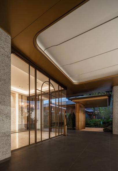 以横向舒展檐口让建筑更加轻盈灵动,更大窗墙比设计,将远景近水引入室内,温暖质感的白金立面配色搭配现代东方构件,织锦一幅华贵东方的美学封面。