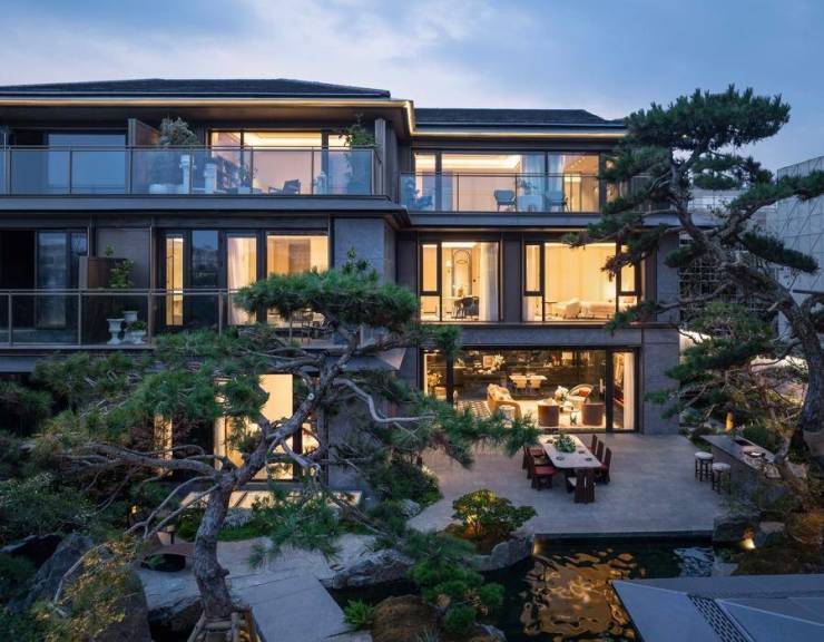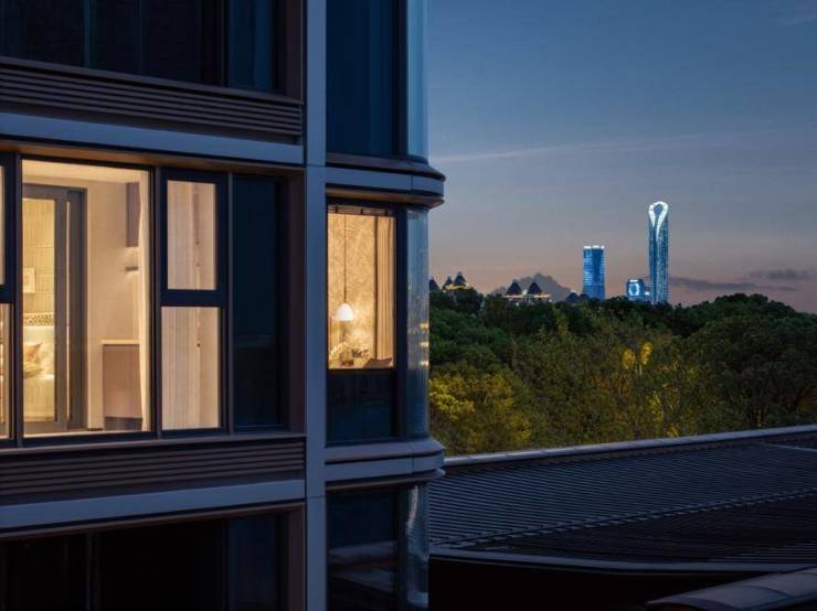 极简的线条、大幅的玻璃立面,合院以一种“隐贵”的姿态,将光、风、景请进室内。窗外是私家庭院,远眺是湖光天色。邻户间的竖向遮光构件、立面的格栅阳台,这些隐于无形的设计,是对私密的高级守护。而雅灰鎏金色的主调,则用当代色彩转译了苏州淡雅温润的城市气质,将建筑织锦为一幅可传承的艺术藏品。